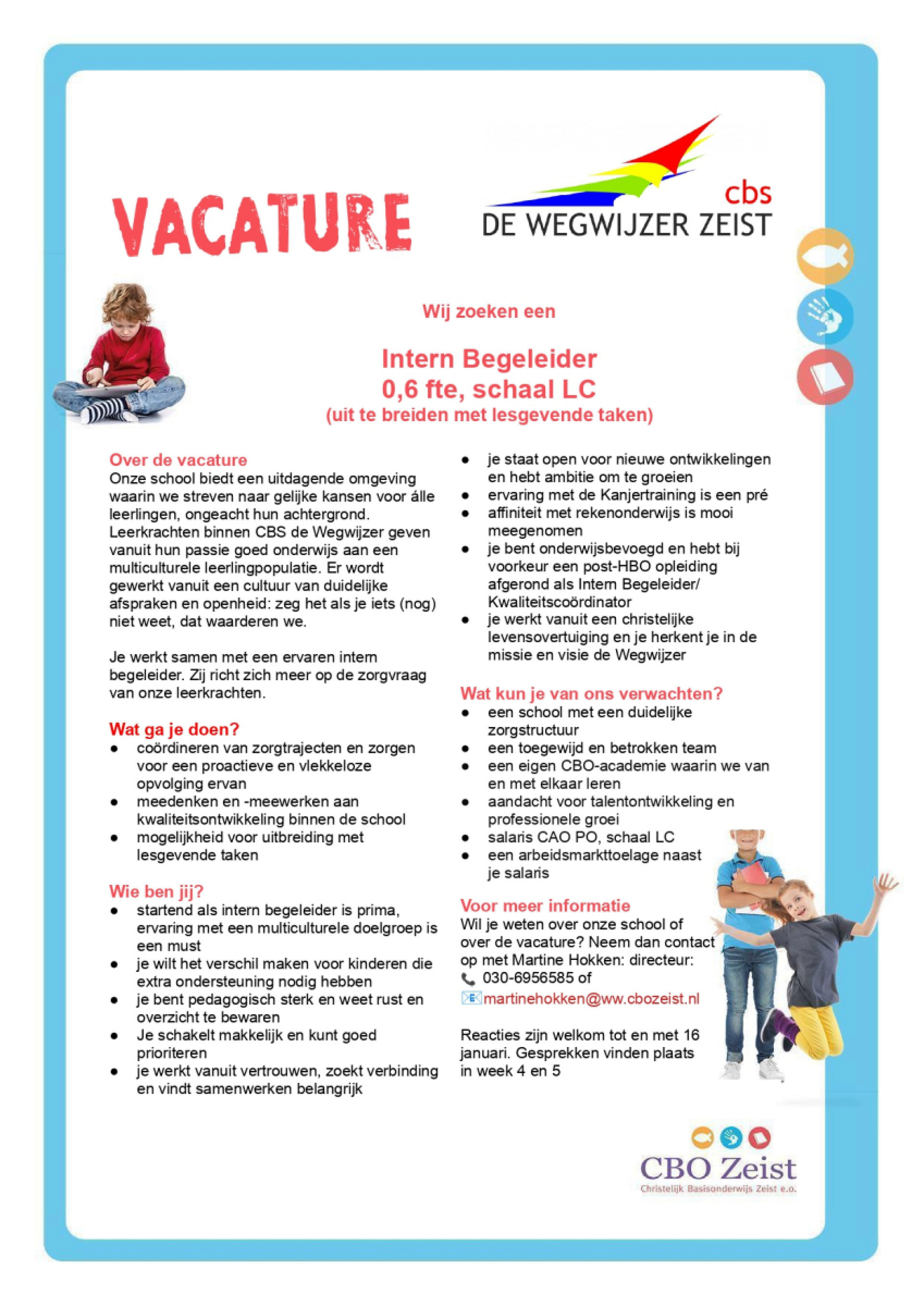 Stuur dan je brief en CV voor 21 juni aanstaande naar directie@ww.cbozeist.nl